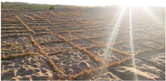 麥草格子,又稱草方格沙障,它是一種防風固沙、涵養(yǎng)水分的治沙方法,網(wǎng)狀的草方格如同無生命的沙漠微型防護帶環(huán)環(huán)相扣,連成一片,蔚為壯觀。