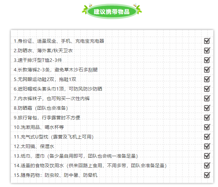 后勤保障:專業(yè)的安全員,營地基本醫(yī)療保障,食宿保障。