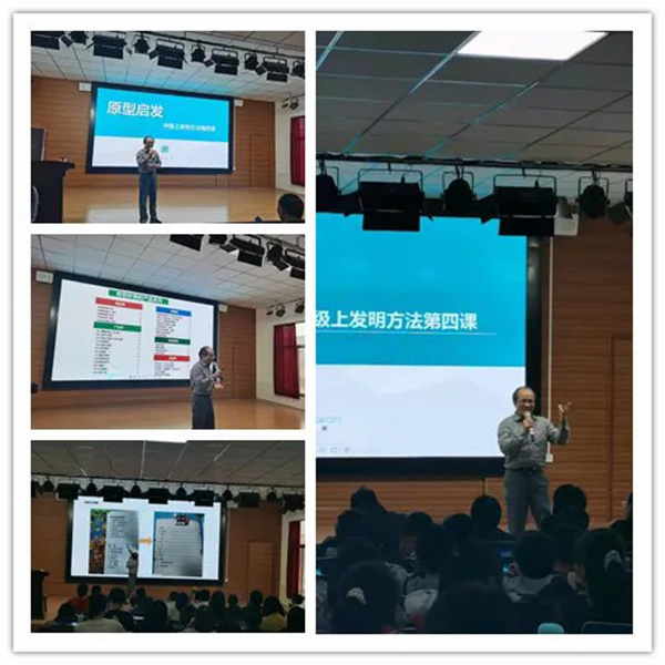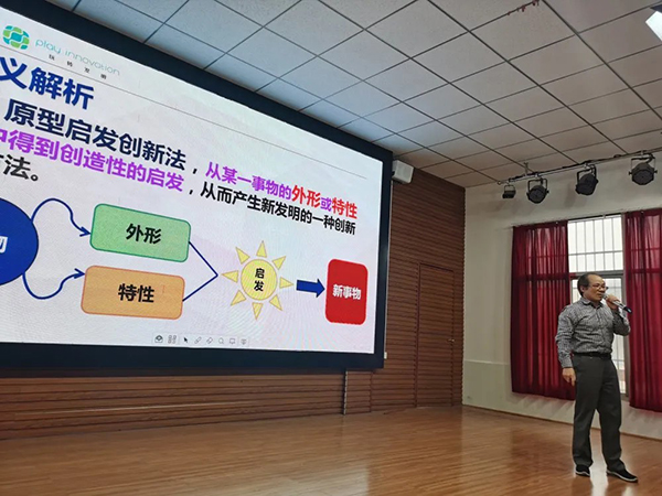 聶教授介紹了兩種發(fā)明方法,一種是原型啟發(fā)創(chuàng)新法,一種是組合發(fā)明法。外形發(fā)明法列舉了生動(dòng)有趣的小故事——鋸子的故事來(lái)闡述,組合發(fā)明法則是通過(guò)和學(xué)生展開(kāi)有趣的互動(dòng),讓學(xué)生將兒童手表和橡皮、紅領(lǐng)巾和鑰匙組合在一起,開(kāi)動(dòng)腦筋發(fā)明出新的東西。聶教授在講座上嚴(yán)謹(jǐn)求實(shí)的科學(xué)態(tài)度和風(fēng)趣幽默的語(yǔ)言風(fēng)格使現(xiàn)場(chǎng)的氣氛達(dá)到了高潮。