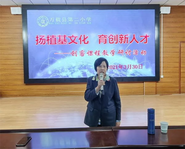 萬(wàn)載縣第二小學(xué)校長(zhǎng)丁瓊瑩致開(kāi)場(chǎng)辭,一方面展示學(xué)校在創(chuàng)客課程中的學(xué)習(xí)成果和收獲,另一方面希望能通過(guò)今天的活動(dòng)汲取聶教授的智慧,將科技創(chuàng)新的種子深植于二小孩子們心中,為他們將來(lái)成為社會(huì)主義接班人打下堅(jiān)實(shí)基礎(chǔ)。
