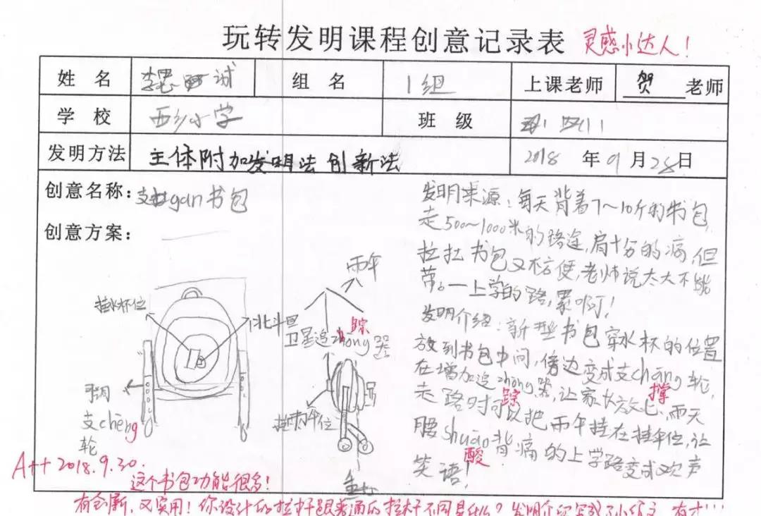 李思誠同學(xué)的思維很清晰,發(fā)明來源和發(fā)明介紹都寫得很詳細(xì),甚至像小作文,感情豐富!這個多功能書包還可以幫忙撐傘,很實(shí)用的創(chuàng)意?。?!