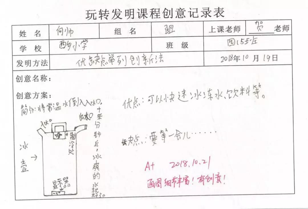 張詩煜同學想發(fā)明一個超多功能的冰箱,我們的思維固定在冰箱怎么可以加熱東西呢,但孩子卻勇敢突破人們的這個思維定式,這種冰箱在未來說不定會實現呢!很多發(fā)明就是從思維定勢中破繭而出的!