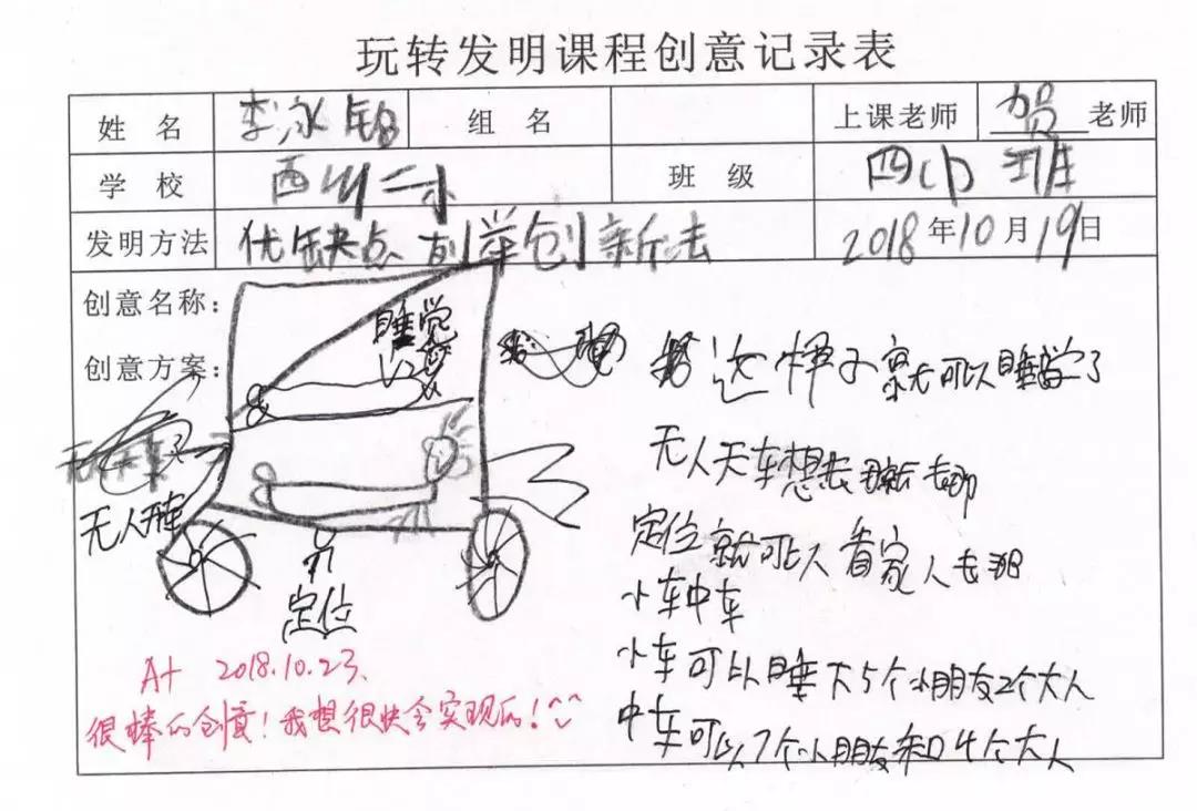 李泳銘同學的想法非常好,無人車,我喜歡!睡著就到了目的地,太棒了!孩子們的想法天馬行空又有科學依據,無人車已經在研發(fā)和試運行了,相信不久的未來,這款車會成為現實?。?!